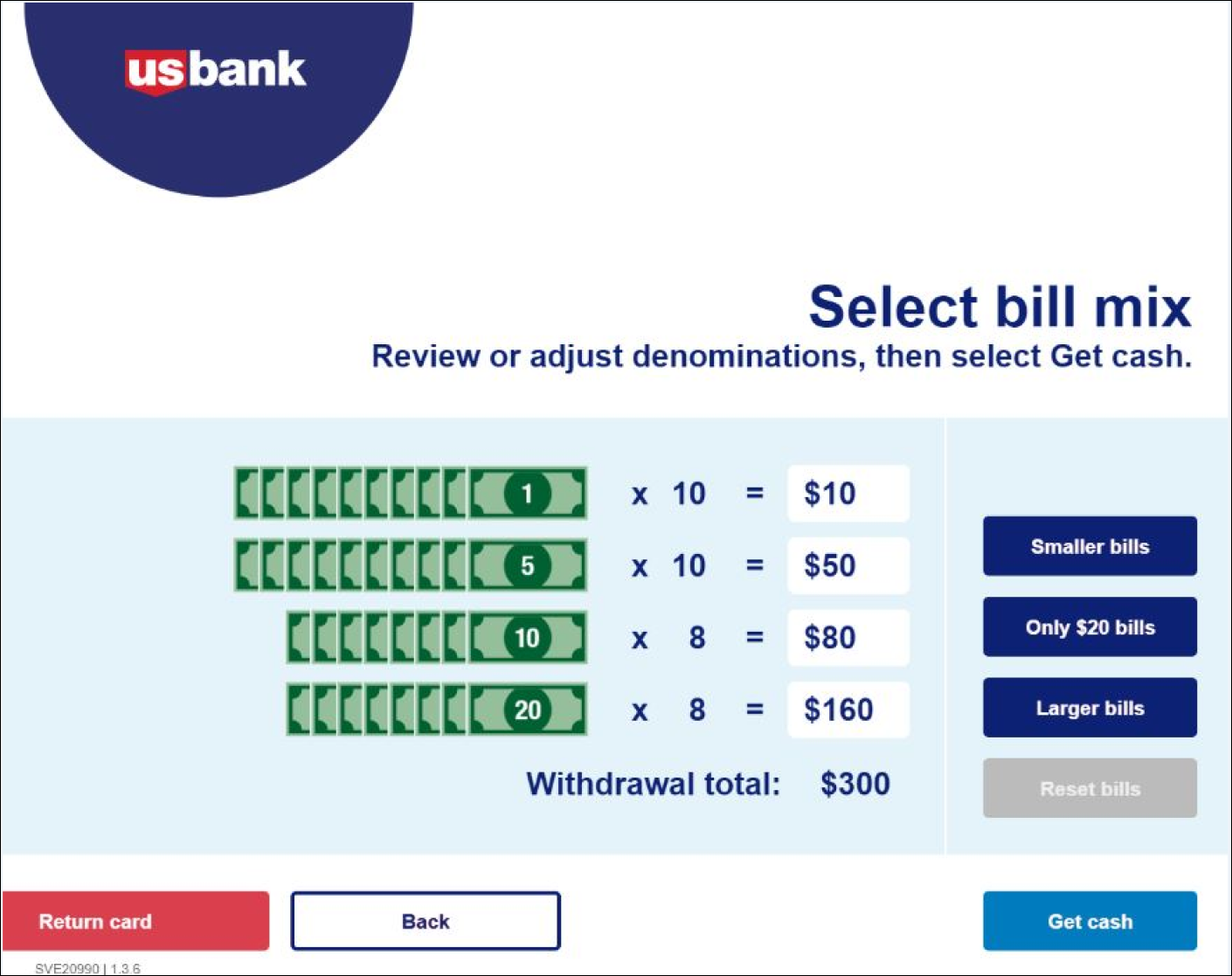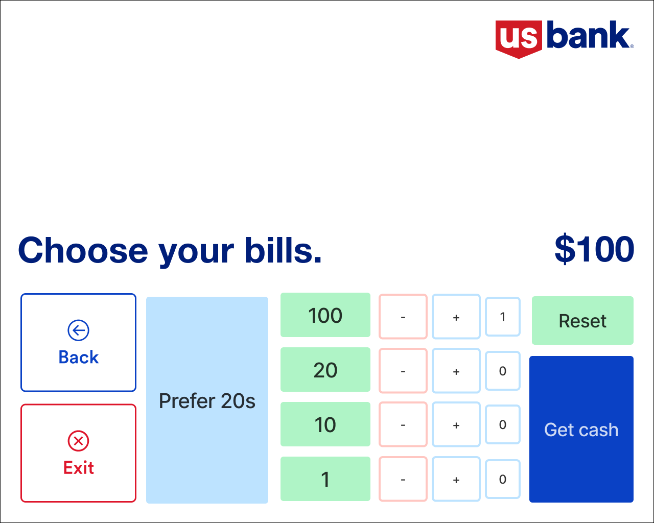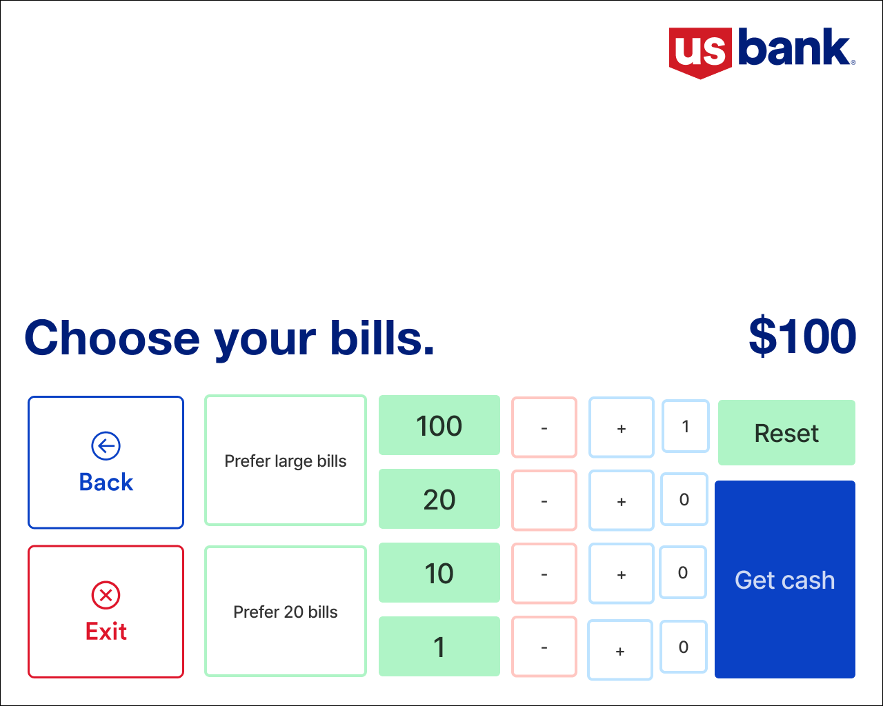 To move forward from “choose your amount,” users took two actions: pick the withdrawal amount, then choose either “Choose bills” or “Get cash.” The options led to unintended results. Some users who wanted a different bill mix picked “Get cash,” not knowing that path wouldn’t let them choose bills at all.