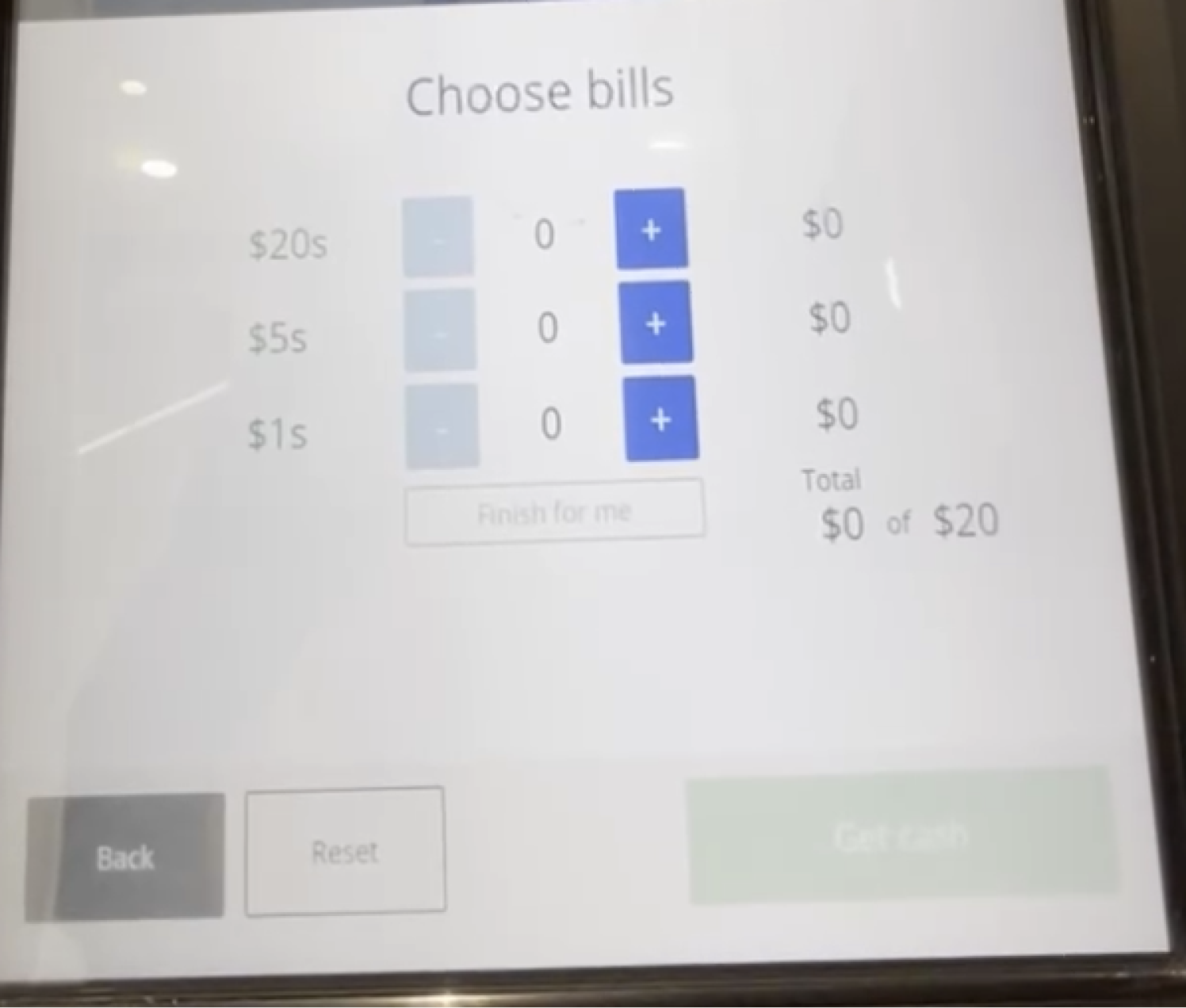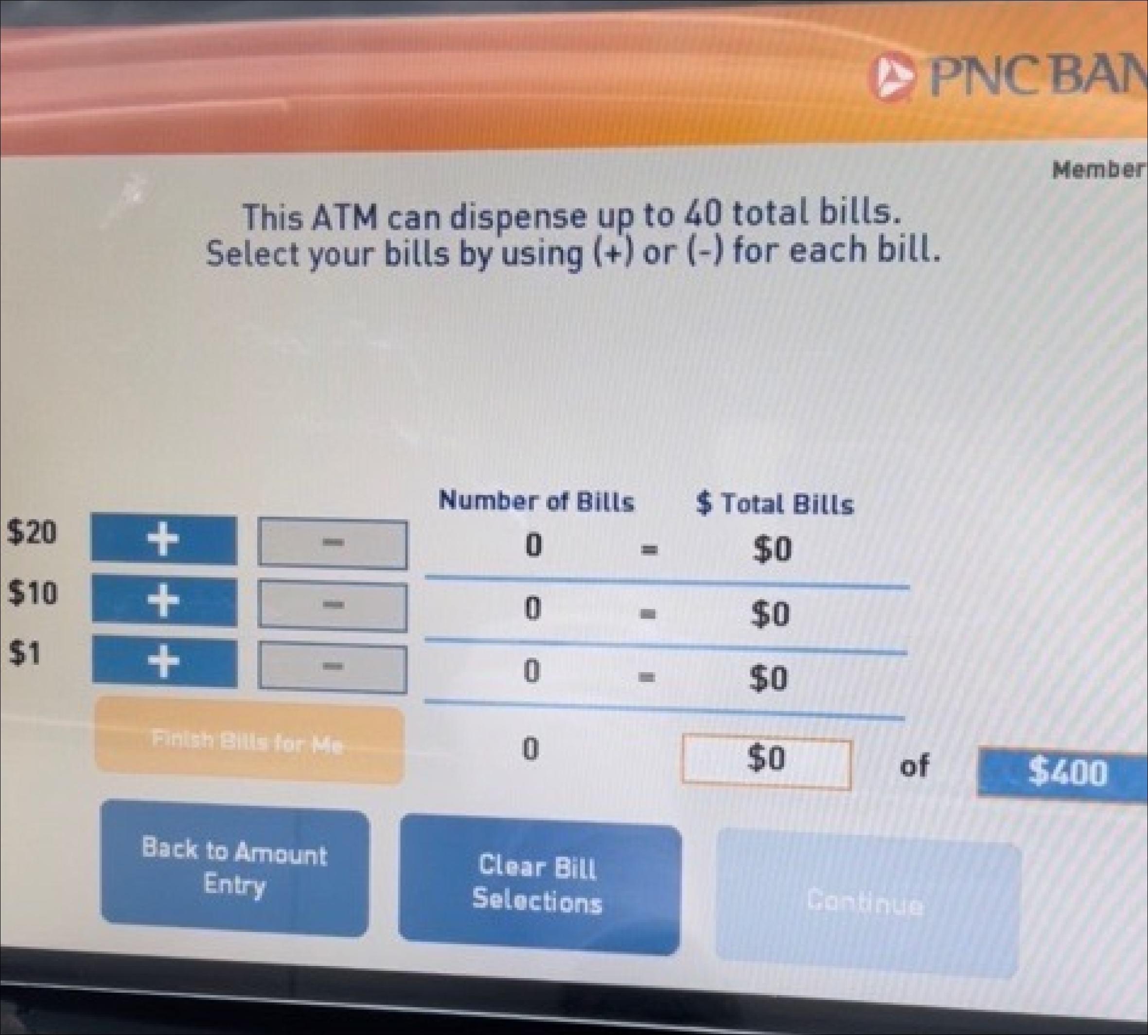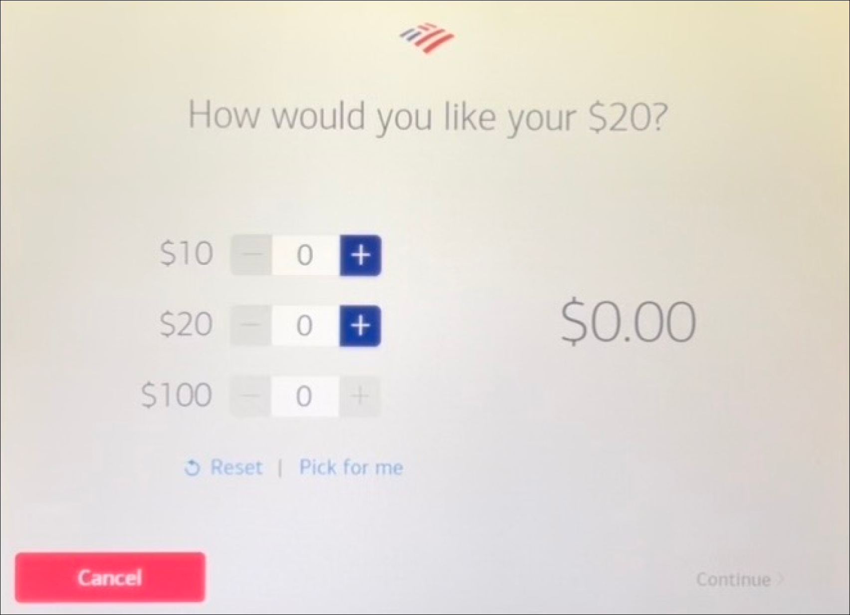 An earlier generation of the ATM had dedicated buttons for “Smaller bills,” “Only $20 bill,” “Larger bills,” and “Reset bills.” It wasn’t a perfect solution (users could only specify denominations in the “Only $20 bills” path), but it treated bill preference as a first-class choice rather than a downstream branch.